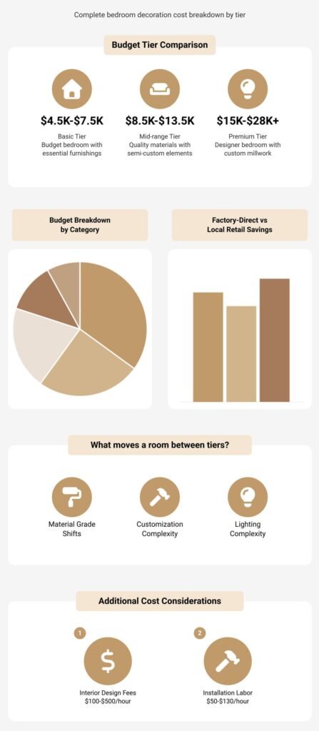 Context: Furnishing alone often runs from a few thousand up to $15,000+ for a room depending on quality, and full remodels can push well beyond, per the HomeGuide bedroom remodel cost page (2025) and Angi’s 2025 summary.